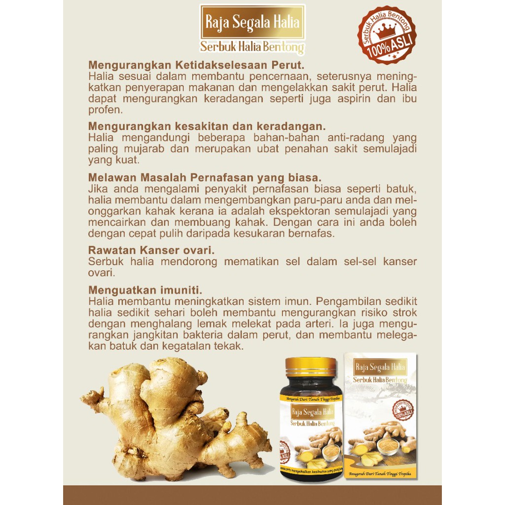 Minyak Herba Asmak 50ml. Dua kultivar halia yang telah lama ditanam di Malaysia ialah Halia Bentong Halia Bukit Tinggi dan Halia Tanjung Sepat Halia. Selain itu halia bentong juga dapat digunakan sebagai obat sakit perut saat nyeri haid.